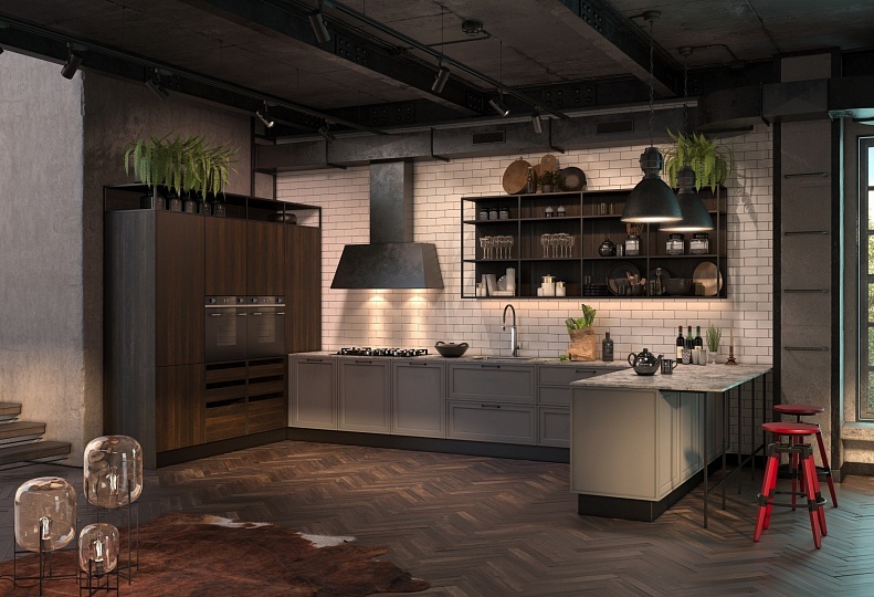 Коллекция Degno classic loft разработана в соответствии с тенденциями, отражающими изменения в образе жизни современного человека. Продукт закрывает основные актуальные стилистические тренды в дизайне мебели. Кухня в стиле лофт - это крушение всех стереотипов, выражение свободы и творчества. Такой интерьер понравится настоящим городским жителям. При всем своеобразии и несравненном промышленном колорите, лофт сумел войти в наши интерьеры. Он стал оригинальным решением и для кухни: Теперь актуальны не потертые фасады, а неоклассические, в эмали, спокойные и даже аскетичные Обязательным атрибутом по-прежнему остаются металлические элементы, но теперь уже не индустриальные трубы, а тонкий черный матовый профиль Древесные декоры никуда не ушли, но теперь они не аутентичные, а спокойные и элегантные, демонстрирующие натуральную красоту дерева Акценты создаются в деталях, например с помощью подвесных светильников. Коллекция разработана промышленным дизайнером Екатериной Даниловой специально для бренда DELTA