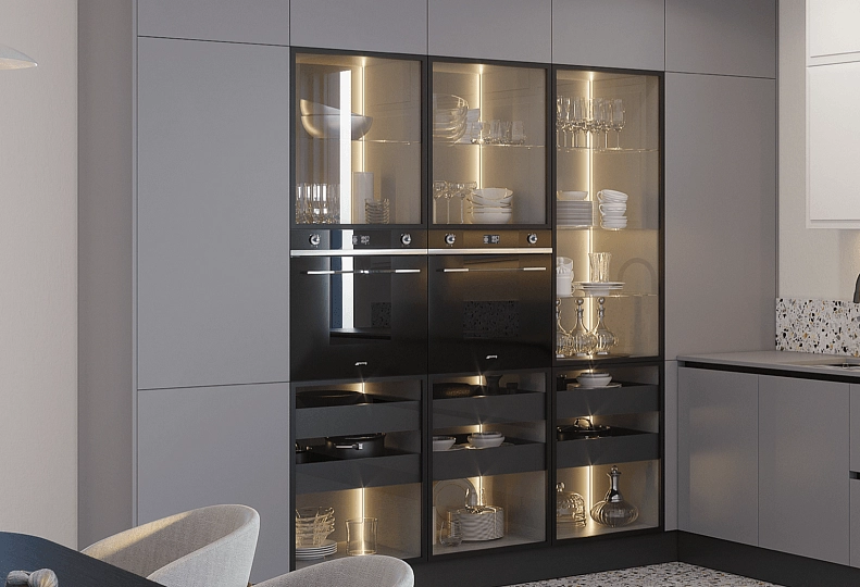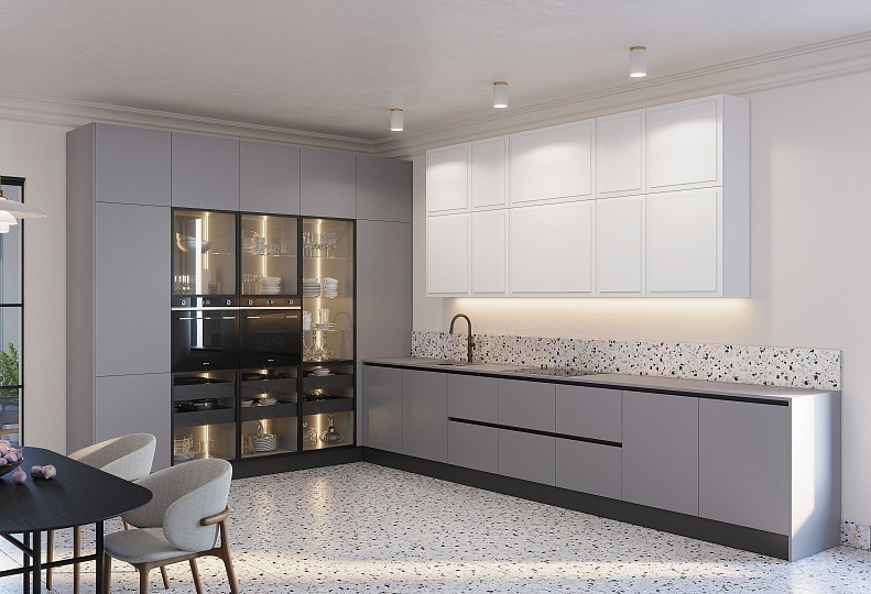 Коллекция RECODO contemporary разработана в соответствии с тенденциями, отражающими изменения в образе жизни современного человека. Продукт закрывает основные актуальные стилистические тренды в дизайне мебели. Для проектов в современном лаконичном стиле мы предлагаем использовать фасады RECODO исключительно в матовом исполнении и как отдельную функциональную группу. Например, вы можете сделать группу навесных шкафов (как показано на визуализации) или остров или полностью одну часть композиции. Наиболее эффектный результат будет в сочетании с матовыми фасадами Fenix, в которых могут быть выполнены другие функциональные зоны композиции (например, витрины, группа нижних модулей и т.д., в зависимости от построения проекта). Прекрасным и смелым акцентом будет использование поверхностей с цветными вкраплениями. В предлагаемом интерьерном решении таким акцентом является декор керамики пола и фартука.