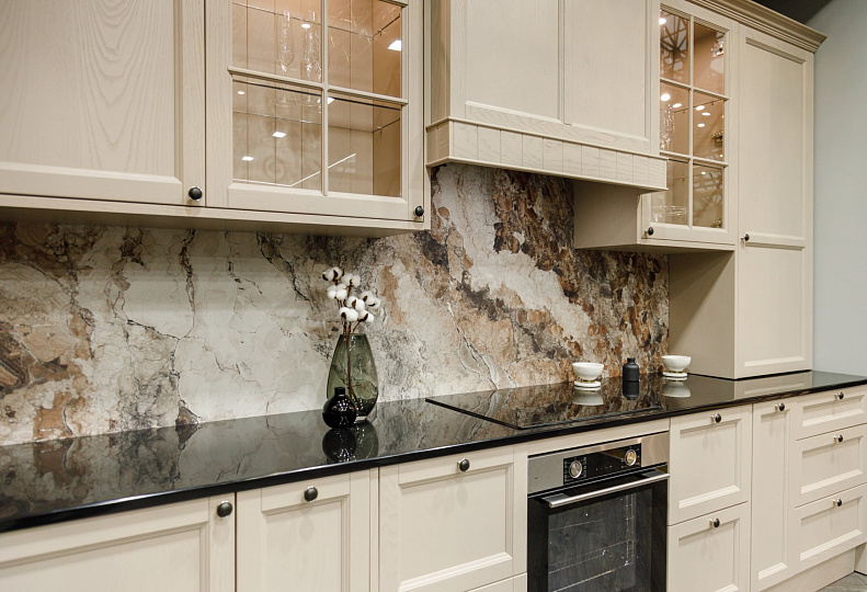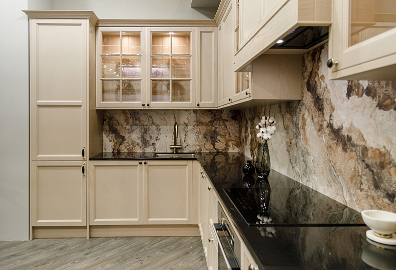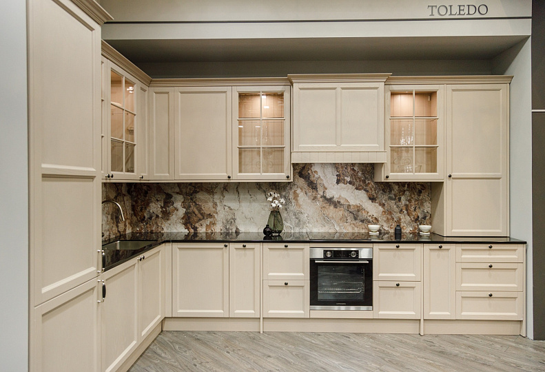Легкая изящная кухня создаёт светлое спокойное настроение. Фасады модели выполнены из массива ясеня. Традиционная компоновка, безмятежные цвета, буазери в модулях с витринами и мрамор – это прямой отсыл к классике. Но это классика в современном прочтении: современные формы фасадов и багет простой геометрии из массива ясеня тяготеют к скандинавскому стилю. Классический кухонный гарнитур с акцентом на тренды 2023 года: современные формы фасадов и багет простой геометрии из массива ясеня тяготеют к скандинавскому стилю. Модель имеет свой модульный ряд, также возможно производство по нестандартным размерам. Актуальной и практичной ее делает функциональное наполнение ящиками и корзинами, приятными функциональными деталями такими, как, например, мойка с подклейкой под столешницу. Кстати, мойка может быть подклеена не только в привычные пластиковые столешницы или камень, но и в компакт-плиту.